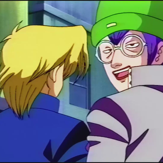 This one-of-a-kind cel features Yugi Mutou during the memorable confrontation scene from Episode 9, “Explosion – The Ultimate Secret Yo-Yo Technique.”